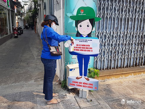 Đoàn thanh niên phường Tân Chính (quận Thanh Khê TP Đà Nẵng) lắp đặt các mô hình tuyên truyền gắn kèm bình nước sát khuẩn tại các khu dân cư để người dân phòng, chống dịch Covid-19 (Ảnh: HC) |
