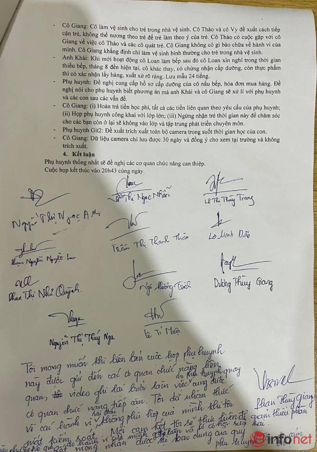 Tại cuộc họp này, cô Giang thừa nhận mất kiểm soát, có hành vi sai trái đánh trẻ và cam kết thực hiện đầy đủ yêu cầu của phụ huynh.