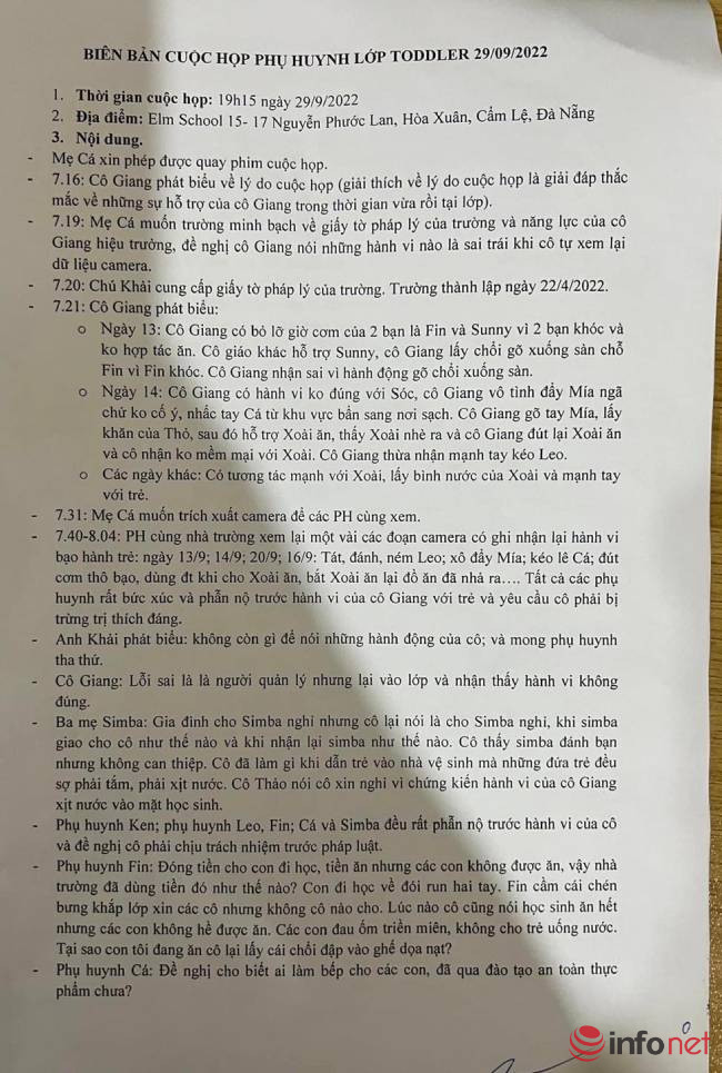 Tại cuộc họp tối ngày 29/9, phụ huynh học sinh F phẫn nộ: “Đóng tiền cho con đi học, tiền ăn nhưng các con không được ăn, vậy nhà trường đã dùng tiền đó như thế nào? Con đi học về đói run hai tay. F cầm cái chén bưng khắp lớp xin các cô nhưng không cô nào cho. Lúc nào cô cũng nói học sinh ăn hết nhưng các con không hề được ăn. Các con đau ốm triền miên, không cho trẻ uống nước. Tại sao con tôi đang ăn, cô lại lấy cái chổi đập vào ghế doạ nạt”.