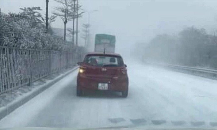 Tìm hiểu sự việc, những người tham gia giao thông qua con đường và người dân sống cạnh đường này cho biết đây không phải là do “tuyết phủ” mà do xe chở bột đá làm rơi vãi ra đường.