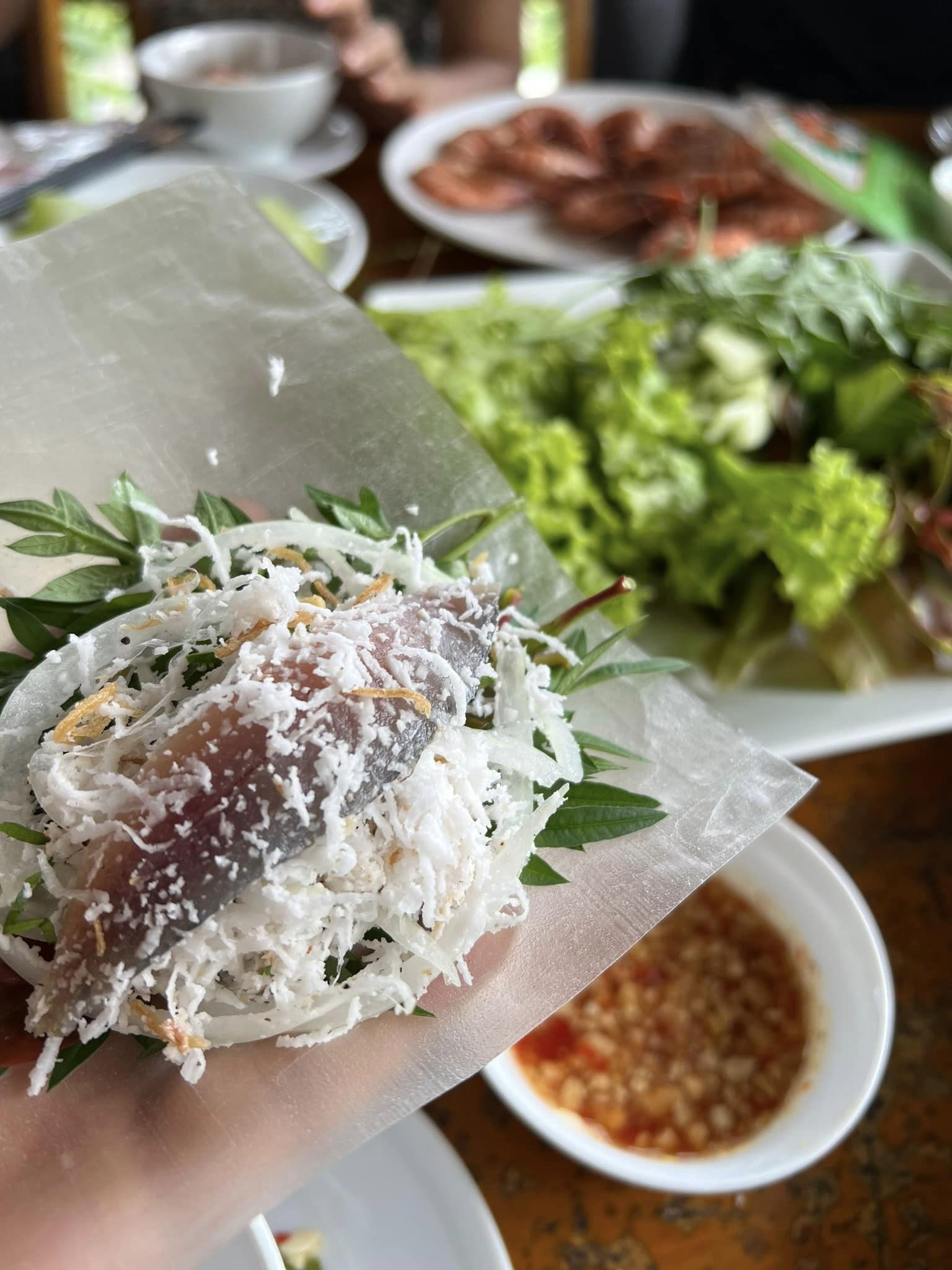 Miếng bánh tráng mềm dai hòa quyện với vị thanh mát của các loại rau, vị béo mềm, ngọt dịu của cá trích cùng hương thơm của dừa nạo sợi, lạc rang khiến thực khách ăn một lần nhớ mãi.