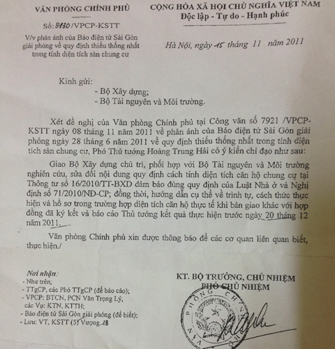 Theo tìm hiểu của PV Infonet, ngày 15/11/2011, Văn phòng Chính phủ đã có công văn số 8130/VPCP-KSTT gửi Bộ Xây dựng và Bộ Tài nguyên và Môi trường về chỉ đạo của Phó Thủ tướng Hoàng Trung Hải về quy định thiếu thống nhất trong cách tính diện tích sàn chung cư.
