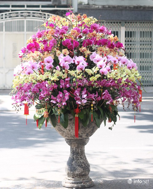 Những cành lan Hồ điệp được cắm trong chậu này được nhập khẩu từ Nhật Bản, cánh hoa to hơn so với hoa trong nước. Chậu hoa này gồm 8 tầng, 7 sắc hoa và để hoàn thành phải cần 3 thợ cắm hoa chuyên nghiệp làm việc liên tục trong 7 giờ đồng hồ. Giá bán chậu hoa này vào khoảng 80 triệu đồng.