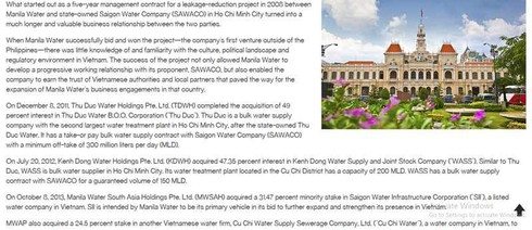 Vào tháng 8/2011, Thu Duc Water Holdings Pte. Ltd. - TDWH (của Manila Water) đã thâu tóm 49% cổ phần tại CTCP B.O.O nước Thủ Đức (Thu Duc Water B.O.O. Corporation), đơn vị cung cấp gần 20% lượng nước cho TP.HCM. Đây là doanh nghiệp cung ứng nước bán sỉ, với nhà máy lớn thứ hai tại TP.HCM, chỉ xếp sau CTCP Cấp nước Thủ Đức - TDW (Thu Duc Water), một công ty đang niêm yết trên sàn chứng khoán TP.HCM. Thu Duc Water B.O.O. có hợp đồng cung cấp nước cho Tổng Công ty Cấp nước Sài Gòn (Sawaco) với công suất 300 triệu lít mỗi ngày.