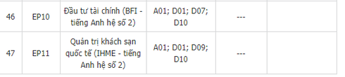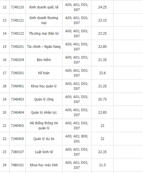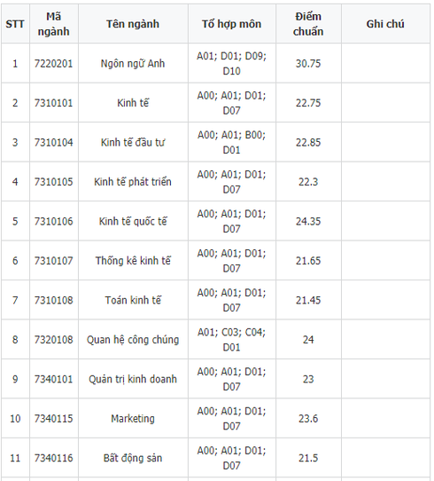 Điểm chuẩn cụ thể vào từng ngành của ĐH Kinh tế Quốc dân 2019 như sau: