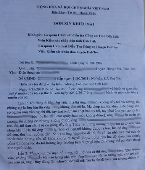 Đơn tố cáo của chị Q. về việc bị ông T. cưỡng bức |