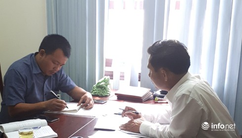 Ông Võ Tất Huy (áo trắng) đang làm việc với PV . |