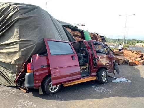 Ghi nhận của PV Infonet tại hiện trường, sau tai nạn, chiếc xe ô tô bán tải bị hư hỏng phần đầu; xe container lật nghiêng giữa đường khiến nhiều lóng gỗ có kích cỡ lớn nằm lăn lóc đầy đường.