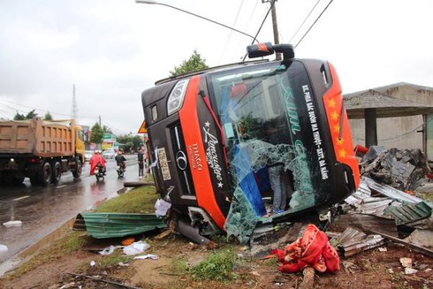 Theo thông tin ban đầu, vào thời điểm trên, tài xế Tôn Thất Hoàng Vũ (37 tuổi, ngụ TP Đà Nẵng) điều khiển xe khách giường nằm mang BKS 47B:024.39 (của nhà xe Kim Oanh), chạy theo hướng TP Đà Nẵng về Đắk Lắk đã phanh gấp, rê bánh, quay ngược đầu rồi lật sang bên phải đường, đè gãy 1 trụ điện và hàng rào một nhà dân.