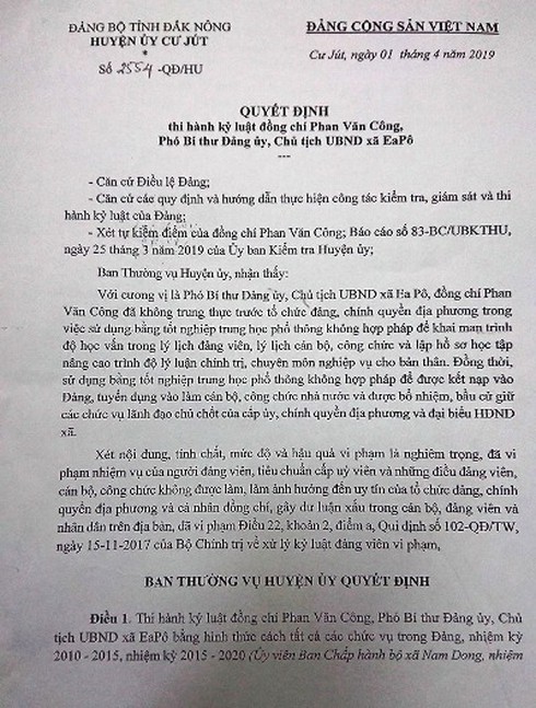 Trước khi bị bắt, ông Công được chuyển đến làm Chủ tịch UBND xã Ea Pô. Khi phát hiện ra hành vi giả dối của ông Công, tháng 4/2019, Huyện ủy Cư Jút đã cách tất cả các chức vụ trong Đảng đối với người này. Sau đó, ông Công tiếp tục bị xử lý kỷ luật bằng hình thức buộc thôi việc để phục vụ công tác điều tra.
