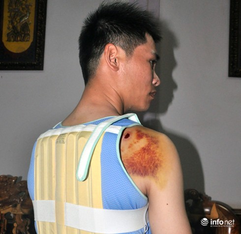 Anh Mậu bị đánh trọng thương và phải nẹp toàn thân |