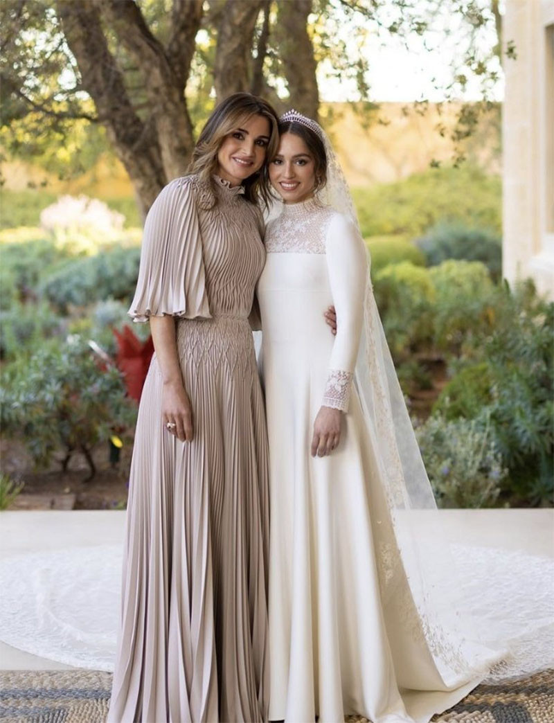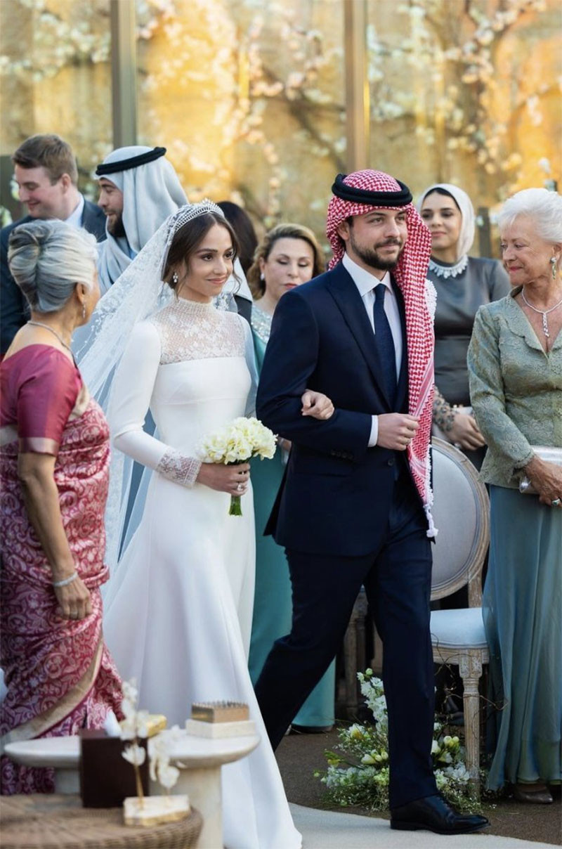 Công chúa Iman diện một chiếc váy cưới màu trắng thanh lịch, có viền đăng ten và đội vương miện kim cương. Cô được anh trai cả - Thái tử Hussein bin Abdullah dẫn vào lễ đường.