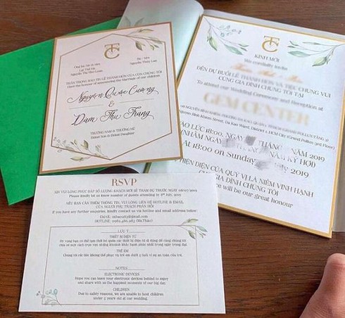 "Chúng tôi rất tiếc không thể phục vụ trẻ em dưới 5 tuổi vì sự an toàn của trẻ", nội dung phần lưu ý trong tấm thiệp Cường đô la và Đàm Thu Trang gửi đến khách mời đám cưới của mình.