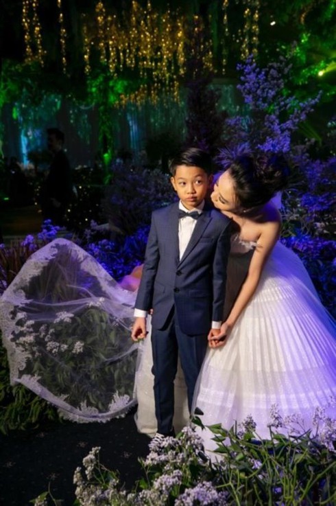 Hình ảnh bé Subeo (con trai của doanh nhân Cường Đô La với vợ cũ Hồ Ngọc Hà) tình cảm bên Đàm Thu Trang khi dự lễ cưới của bố |
