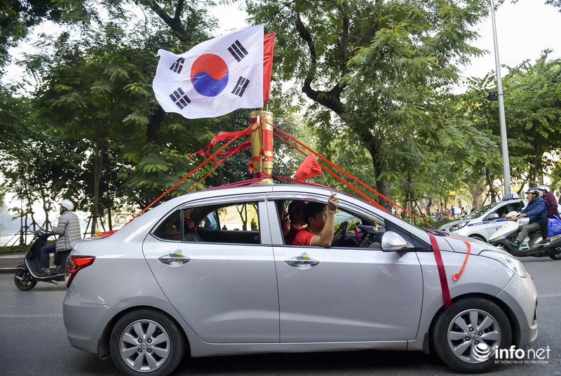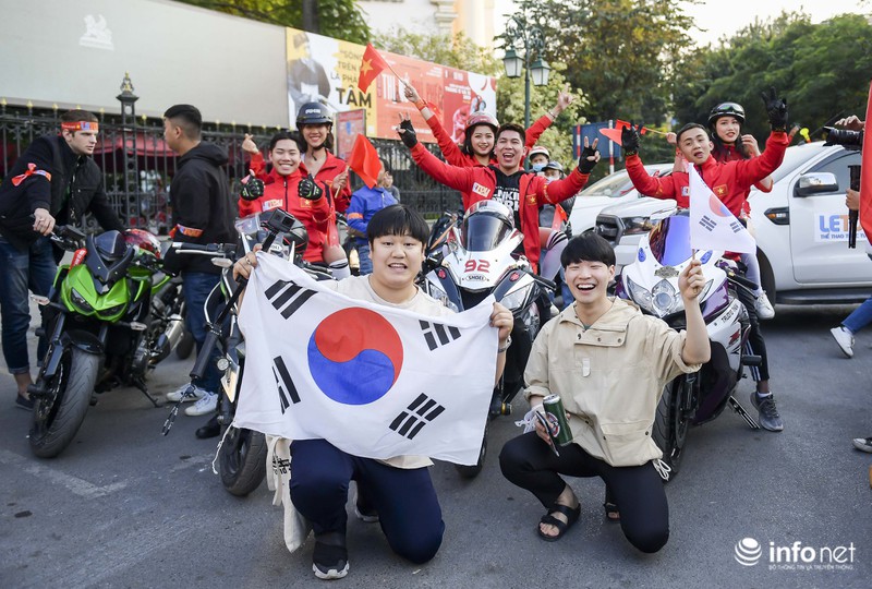 Hai cổ động viên người Hàn Quốc - Quê hương HLV Park Hang Seo, cũng ra đường cổ vũ cùng các cổ động viên Việt Nam.