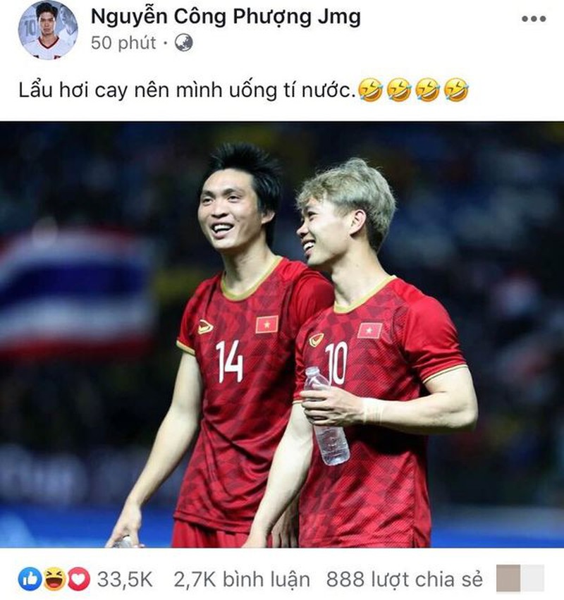Riêng tình huống Công Phượng bị đối phương đá vào bộ hạ, cư dân mạng cũng có những "góc nhìn" bá đạo cho anh. Bản thân Công Phượng cũng chia sẻ trên trang Facebook cá nhân: "Lẩu hơi cay nên mình uống tí nước".