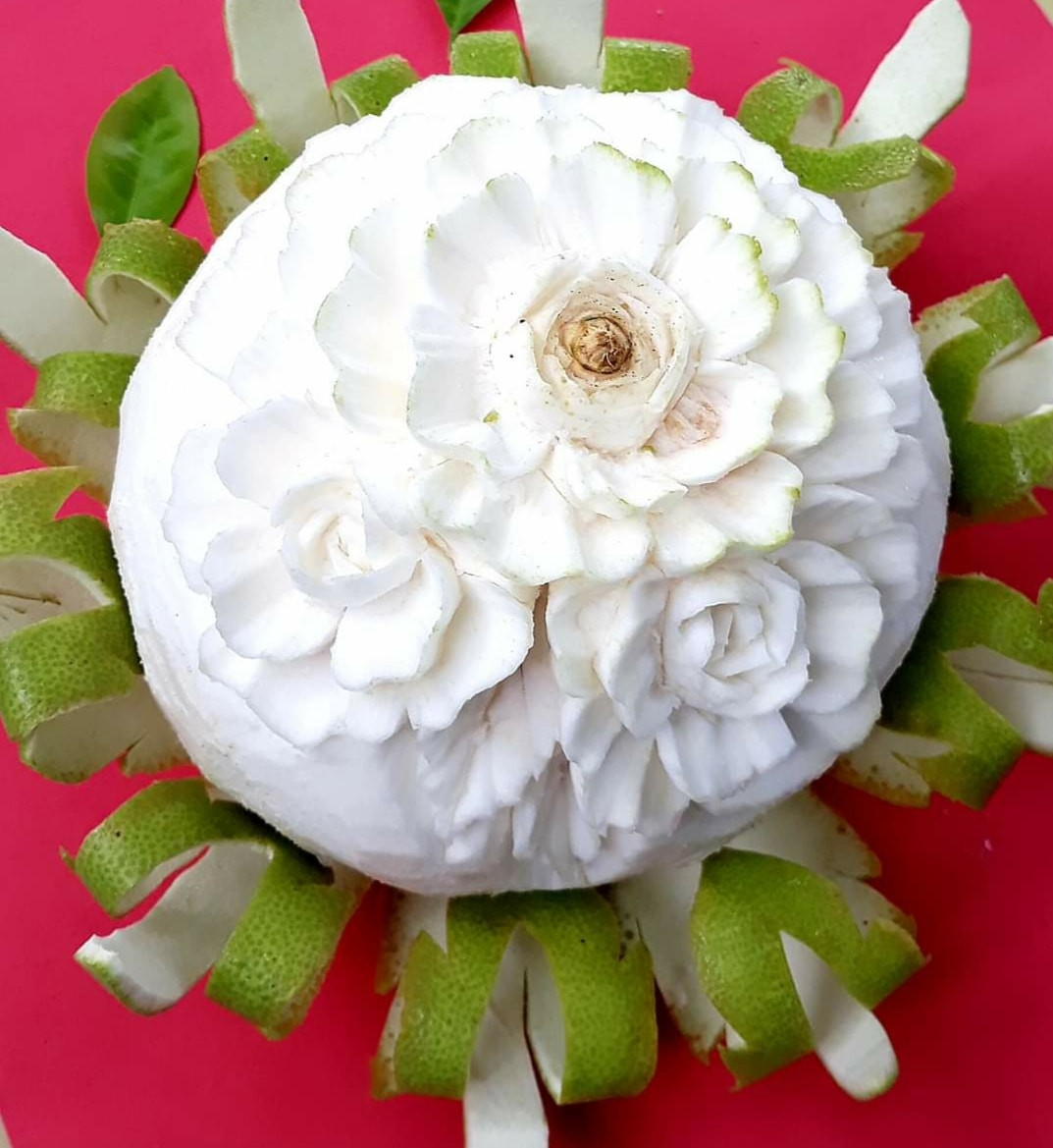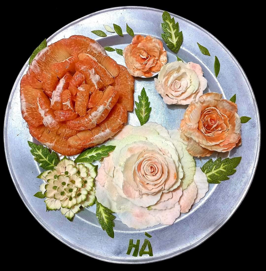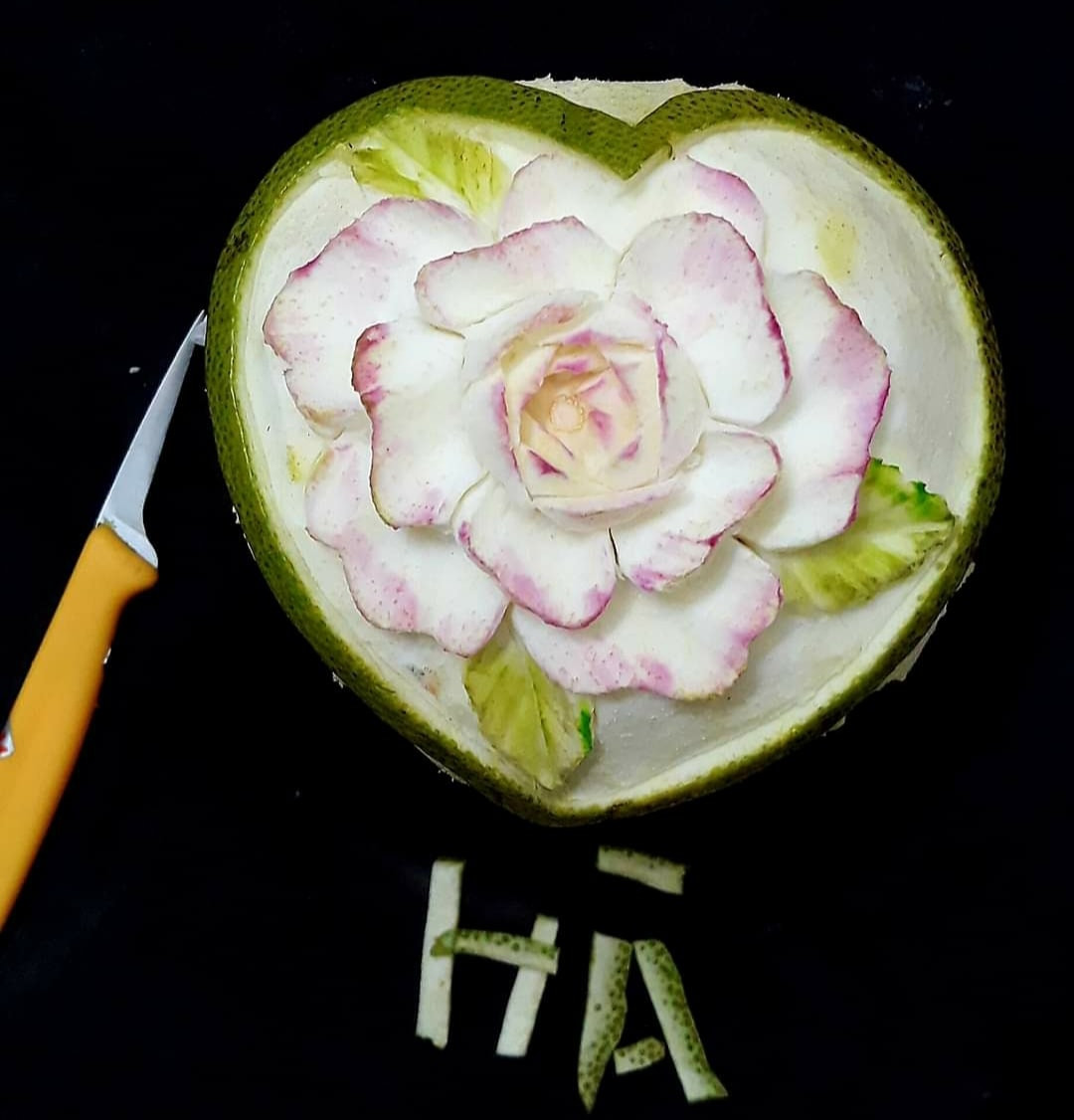 Cùng ngắm những bông hoa đẹp mắt tỉa từ quả bưởi của chị Hà: