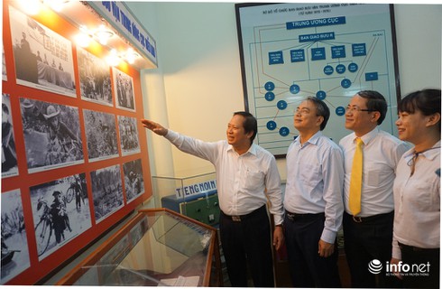 Bộ trưởng cùng đoàn công tác xem lại những hình ảnh tư liệu về hoạt động của cán bộ chiến sĩ ngành Thông tin và Truyền thông trong thời chiến. |