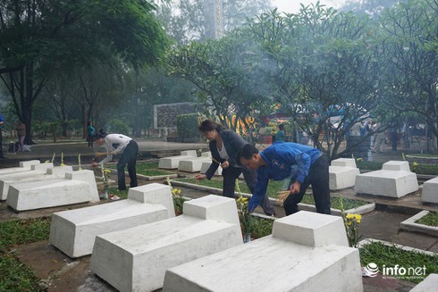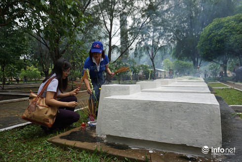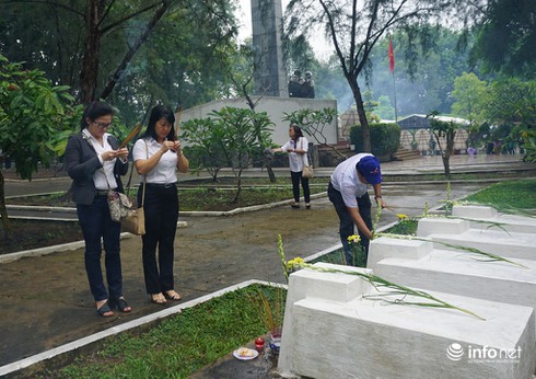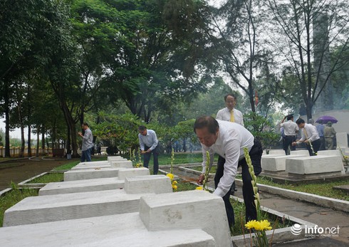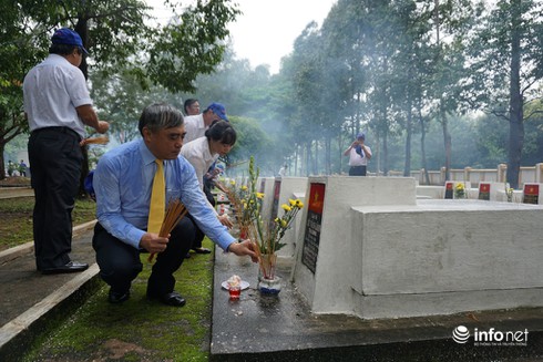 Bộ trưởng Trương Minh Tuấn cùng đoàn thắp hương tại phần mộ các liệt sỹ. |