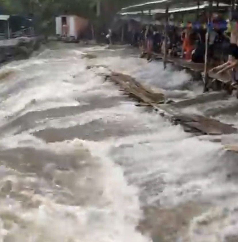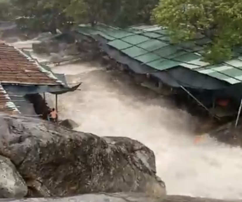 Phát hiện nước lũ đổ về mạnh, người dân và những người làm việc tại thác đã cảnh báo, hô hoán nhau chạy lên các sạp của hàng quán để tránh trú.