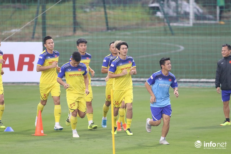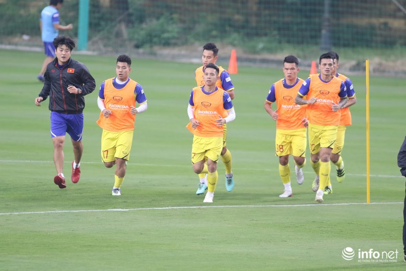 Với lượng quân số chưa đủ, HLV Park Hang-seo và các trợ lý chia đôi đội hình để tập chạy. |