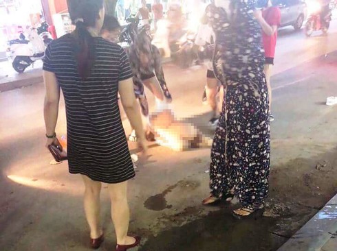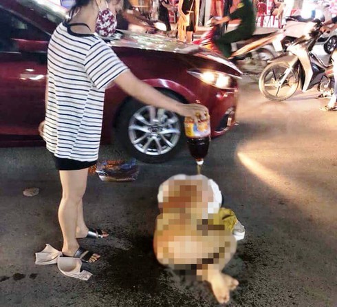 Hình ảnh cho thấy, nhóm người quây xung quanh cô gái, sau đó một người phụ nữ bịt khẩu trang cầm một cái chai (được cho là nước mắm khoảng gần 2 lít) đổ lên người cô gái, sau đó đổ cả ớt bột lên người khiến cô gái này nằm gục xuống mặt đường.