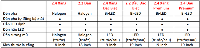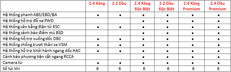 Tính năng an toàn trên 6 phiên bản như sau:
