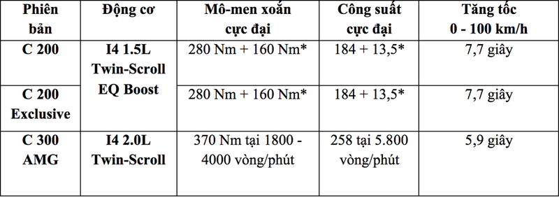 Khi xe cần tăng tốc, máy phát sẽ bổ trợ thêm sức mạnh 13,5 hp và sức kéo 160 Nm trong khoảng thời gian nhất định, giúp động cơ xăng loại bỏ độ trễ tăng áp và nhanh chóng đạt đến vòng tua máy lý tưởng mỗi khi sang số. Ưu điểm của máy phát 48V là sức kéo 160 Nm sẽ can thiệp ngay lập tức và giúp giảm độ trễ. Sự phối hợp nhuần nhuyễn và thông minh giữa động cơ xăng và máy phát 48V giúp người lái luôn tự tin với sức mạnh của xe, nhất là khi phải tăng giảm tốc liên tục. Với công suất 184 mã lực và mô-men xoắn 280Nm có sẵn từ động cơ xăng, C 200/C 200 Exclusive có thể tăng tốc 0 – 100 km/h trong vòng 7,7 giây, tương đương với C 200 trước đây vốn sử dụng động cơ 2.0L.