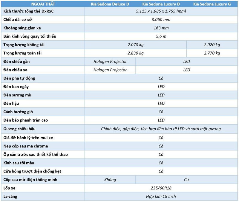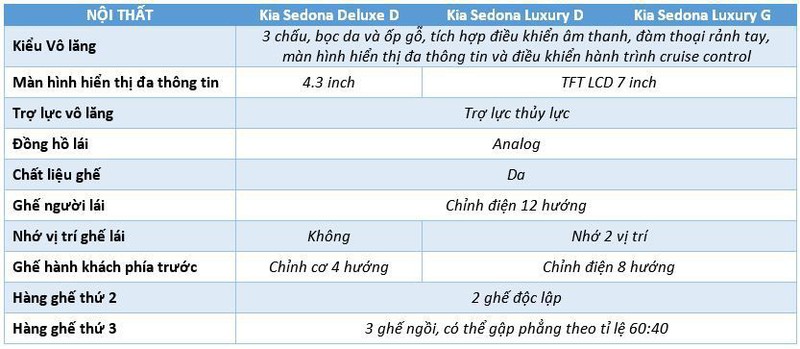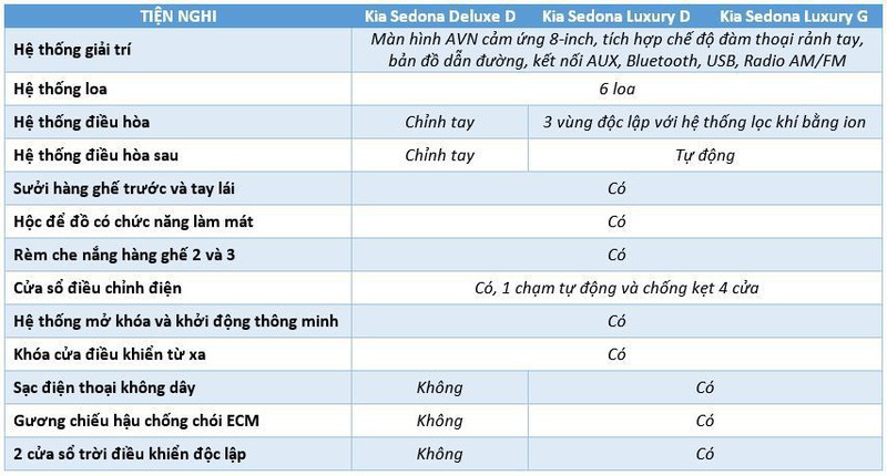 | Kia Sedona Luxury 1,129 tỷ | Kia Sedona Platinium 1,209 tỷ | Kia Sedona Platinium G 1,429 tỷ | KIA Grand Sedona 2.2 DAT 1,180 tỷ |