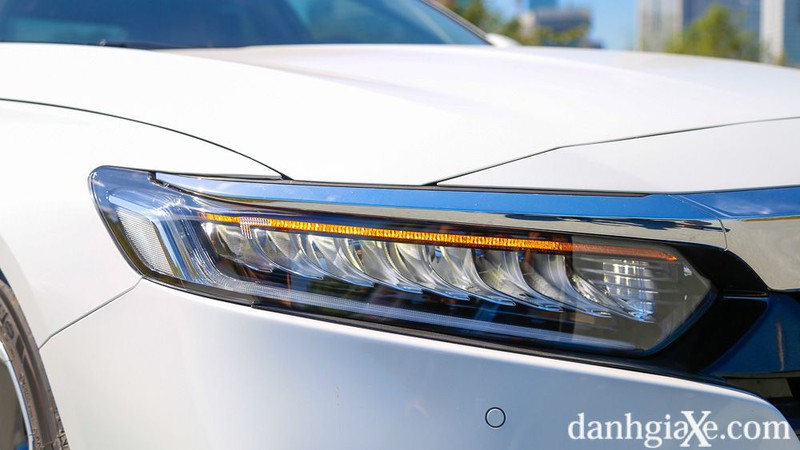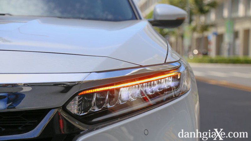 Cụm đèn pha trên Accord 2020 đẹp mắt và long lanh, mang đến cảm giác "hơn" đời trước đôi chút. Dải đèn LED chạy ban ngày bên dưới và dải đèn LED sát nắp capo hơn sẽ làm nhiệm vụ báo rẽ (signal) đi cùng đèn sương mù cũng là LED nhấn mạnh sự sang trọng trên mẫu xe sedan hạng D này.