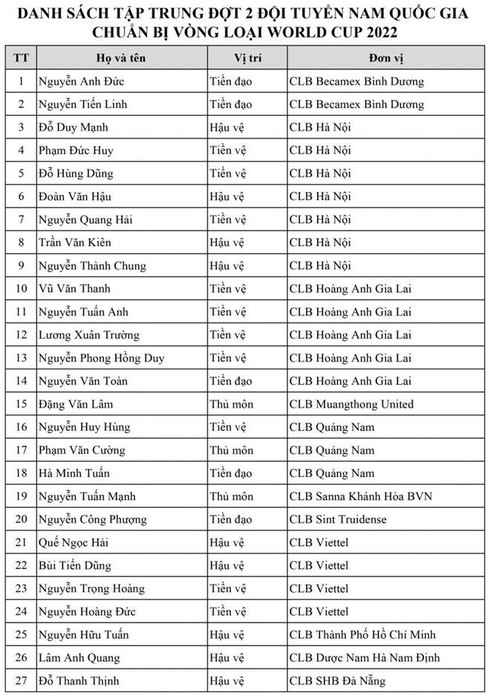 Trong khi đó, hàng loạt gương mặt quen thuộc khác lại cũng được gọi trở lại như Anh Đức, Tiến Linh, Duy Mạnh, Đức Huy, Hùng Dũng, Quang Hải, Xuân Trường, Tuấn Anh, Văn Toàn...