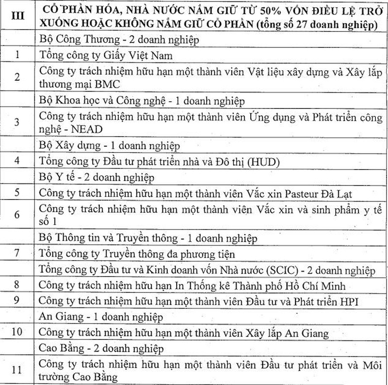 Có 62 doanh nghiệp thực hiện cổ phần hóa, nhà nước giữ trên 50% đến dưới 65% vốn điều lệ. Bên cạnh đó, có 27 doanh nghiệp thực hiện cổ phần hóa, nhà nước nắm giữ từ 50% vốn điều lệ trở xuống hoặc không nắm giữ cổ phần.
