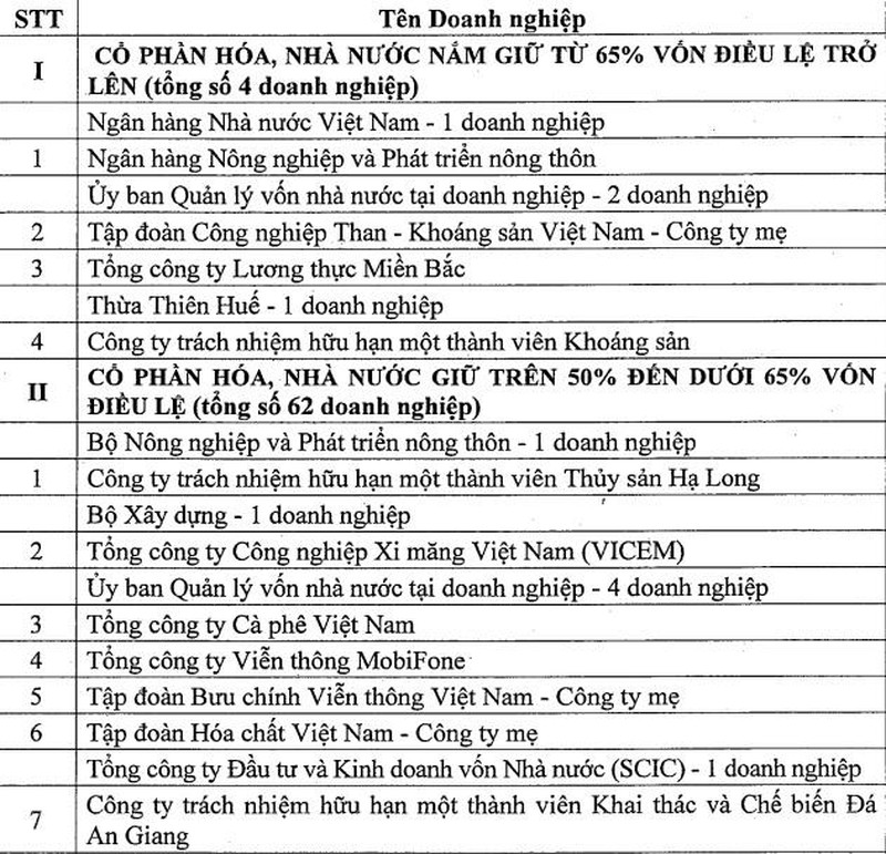 Theo Quyết định, 4 doanh nghiệp thực hiện cổ phần hóa, nhà nước nắm giữ từ 65% vốn điều lệ trở lên gồm: Ngân hàng Nông nghiệp và Phát triển nông thôn; Tập đoàn Công nghiệp Than - Khoáng sản Việt Nam - Công ty mẹ; Tổng công ty Lương thực miền Bắc; Công ty TNHH một thành viên Khoáng sản.