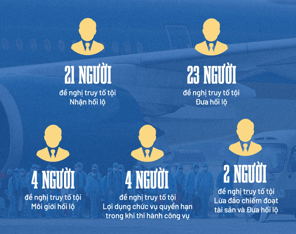 Trong vụ án “chuyến bay giải cứu”, có 21 người bị đề nghị truy tố tội Nhận hối lộ. Những cái tên phải kể đến như ông Tô Anh Dũng, cựu Thứ trưởng Bộ Ngoại giao bị cáo buộc đã nhận hối lộ hơn 21,5 tỷ đồng; bà Nguyễn Thị Hương Lan, cựu Cục trưởng Cục Lãnh sự nhận hối lộ hơn 25 tỷ đồng; ông Đỗ Hoàng Tùng, cựu Phó Cục trưởng Cục Lãnh sự nhận hối lộ hơn 12 tỷ đồng; ông Nguyễn Hồng Hà, cựu Tổng Lãnh sự Việt Nam tại Osaka, Nhật Bản nhận hối lộ hơn 2 tỷ đồng;
