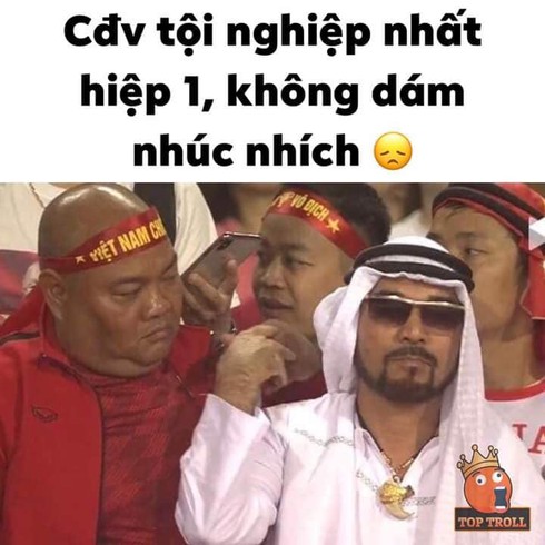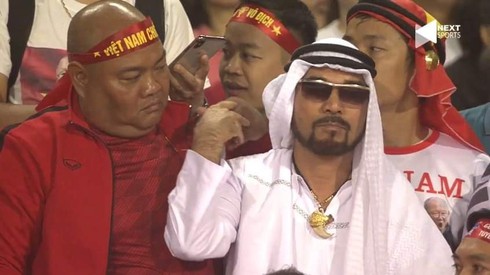 Ngoài những giây phút căng thẳng, bên lề trận đấu cũng không thể thiếu được những "gia vị" để tăng phần hấp dẫn. Và trong số đó, những cổ động viên đặc vô tình lướt qua máy quay luôn là điều khiến nhiều người chú ý. Với bộ quần áo Ả Rập, ngồi lọt thỏm giữa dàn cổ động viên Việt với thần thái vô cùng "luxury", vị cổ động viên đặc biệt vô tình lọt vào ống kính này có lẽ là người đàn ông đặc biệt và cũng...can đảm nhất hôm nay.