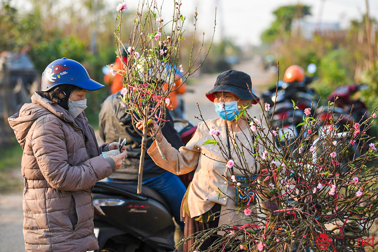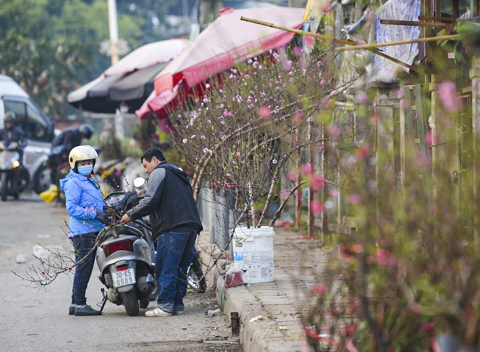 Tại vườn đào Nhật Tân những ngày này, người mua hoa đã bắt đầu tấp nập, nhiều người đến tận vườn để tìm mua những cành đào ưng ý nhất.