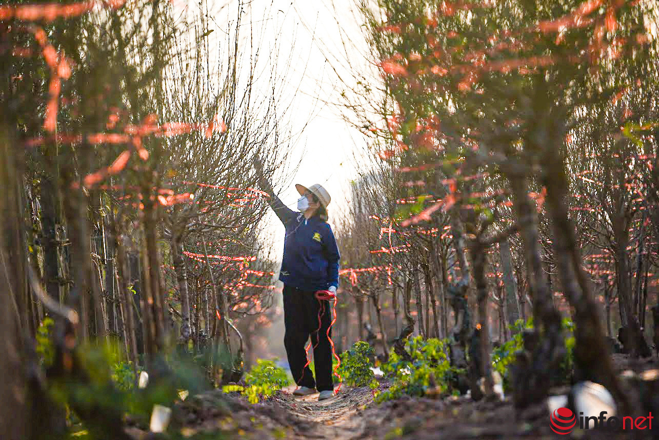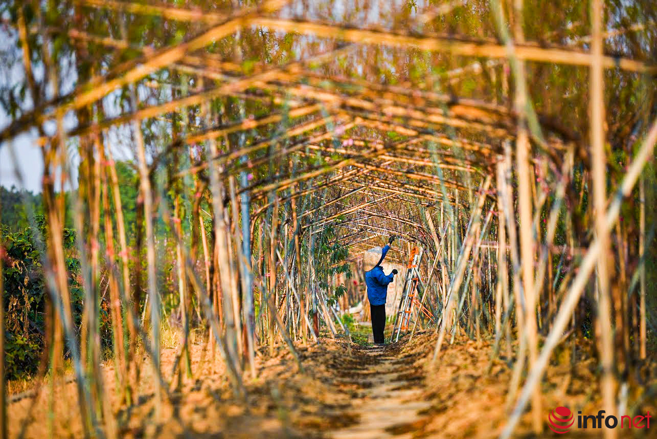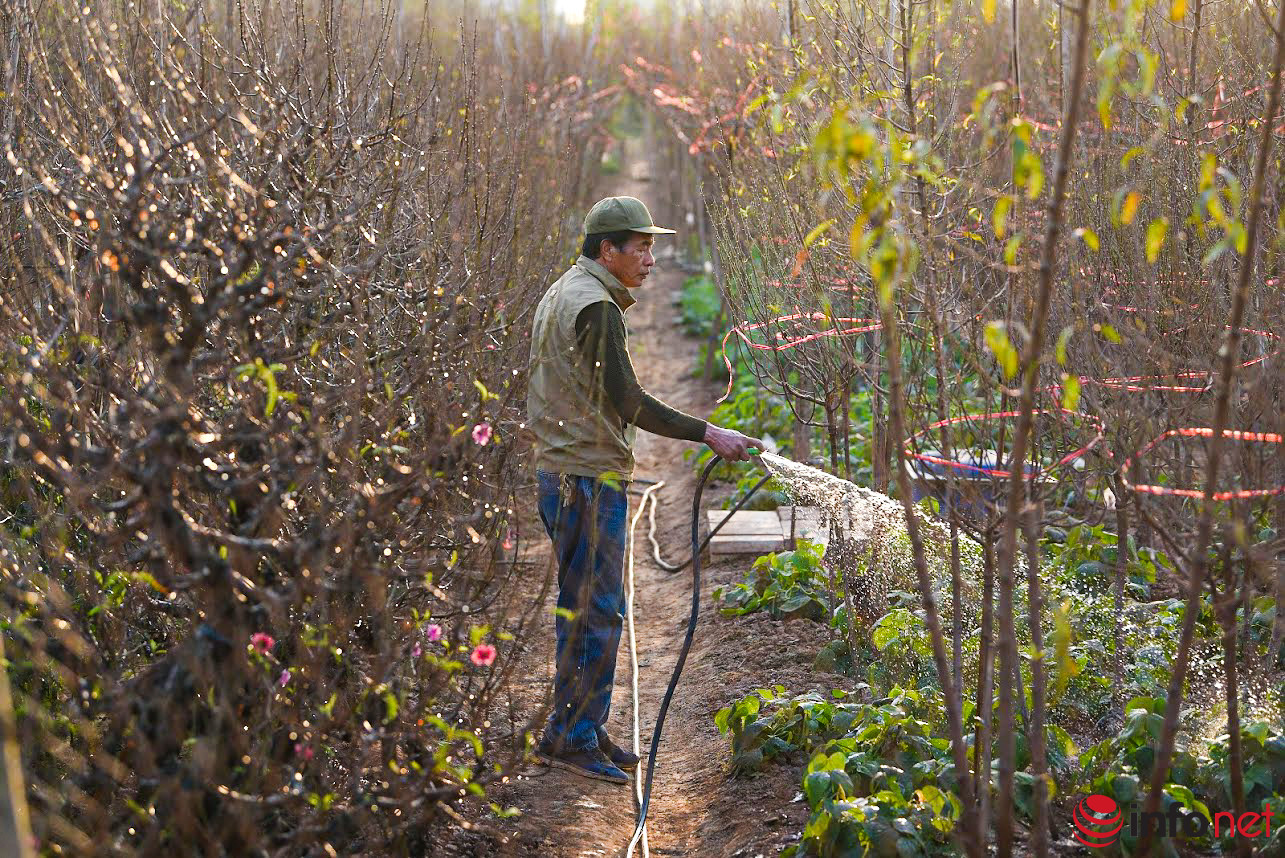 Vườn nhà bà Nguyễn Thị Hà hiện có khoảng 600 gốc đào. "Trước thời điểm này ít ngày, tôi đã tuốt xong lá những cây đào cuối cùng trong vườn và chờ đến ngày gần Tết những nụ đào sẽ nở. Với những cây, cành đang mang ra chợ bày bán, chúng tôi đã kích thích cho hoa nở sớm nhằm phục vụ những người thích chơi đào sớm. Những cành đào nở sớm sẽ có giá cao hơn khi vào chính vụ", bà Hà nói.