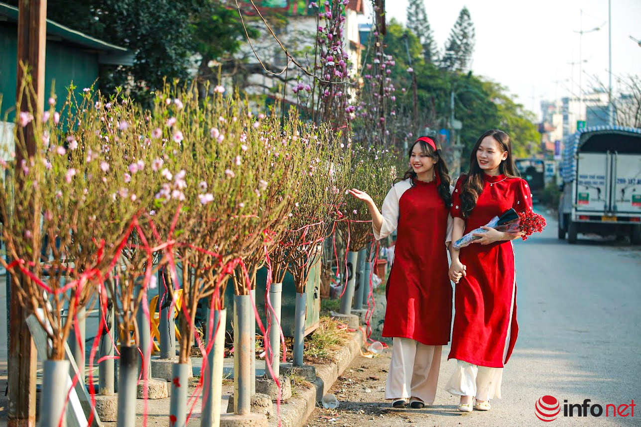 Hai bạn trẻ Hoàng Lê Thảo Vy và Phạm Nguyễn Anh Thư diện áo dài chụp ảnh cùng với hoa đào Nhật Tân nở sớm. “Sắp đến Tết nên 2 chị em tôi tranh thủ thời gian đến đây chụp một bộ ảnh với hoa đào. Tưởng chừng thời điểm này sẽ ít hoa đào nở nhưng khi đến chợ hoa Quảng An, tôi rất bất ngờ khi thấy dọc con đường này rực rỡ sắc hoa”, Thảo Vy bày tỏ.