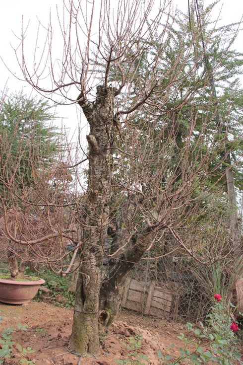 Đây là gốc đào rừng, có độ tuổi khoảng 30 năm được ghép với cành đào Nhật Tân. Gốc thân cây to, khỏe, thế đẹp. |