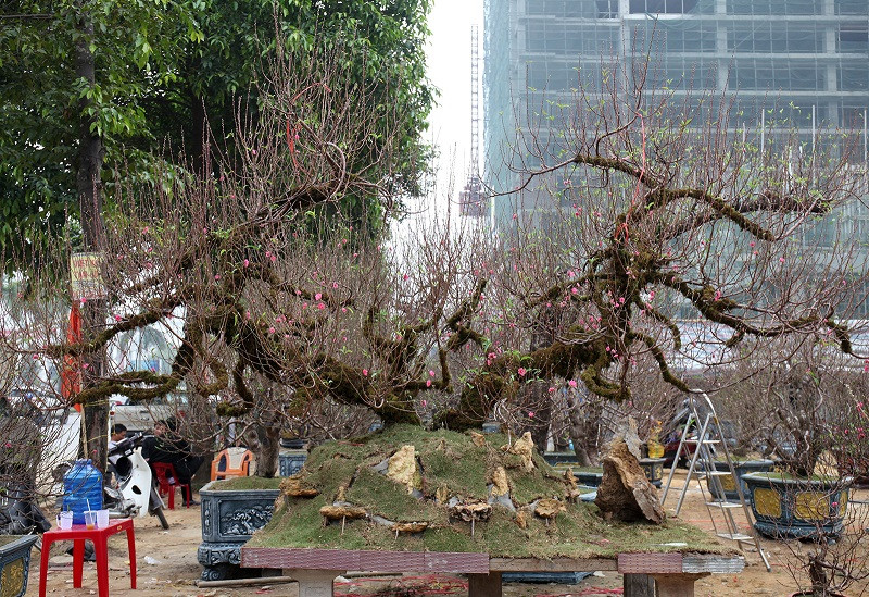 Trong số gần 100 gốc đào bày bán, có gốc đào Nhật Tân cổ thụ được cho thuê với giá 150 triệu đồng/cây.