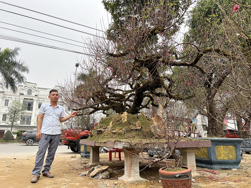 “Gốc đào cổ thụ này được mình săn đón tại nhà vườn từ 5 tháng trước, tuổi đời của chúng lên đến vài chục năm. Chỉ tính riêng thời gian tạo thế cho cây đã mất gần 10 năm. Cây đào này có người gọi là mâm xôi con gà, tuy nhiên, nhiều người xem thì bảo đây là cây đào thế cuồn cuộn như hình rồng bay phượng múa”, anh Cường chia sẻ.