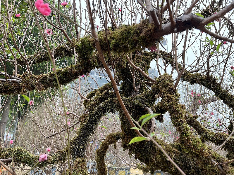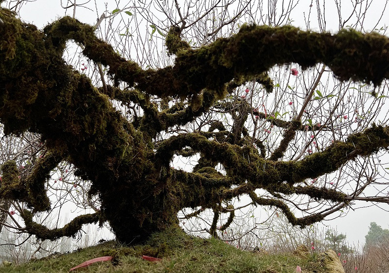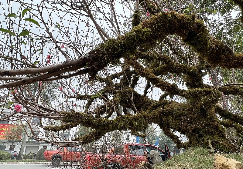 Cây đào cổ thụ này được gia chủ kỳ công cắt ghép, uốn cong theo hình thế đẹp mắt sau nhiều năm chăm sóc. Phần chính thân cây được bao bọc bởi lớp rêu xanh bắt mắt, nhìn qua như một cây cổ thụ già cỗi giữa rừng tự nhiên.
