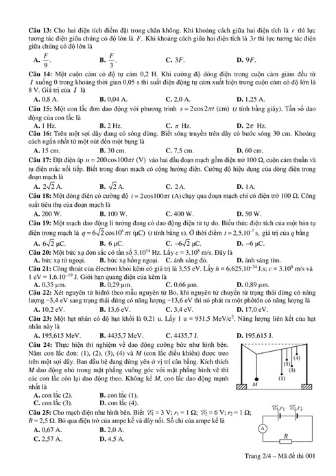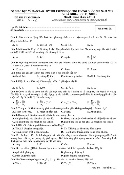 Dưới đây là đề, đáp án chuẩn môn Vật lý đề thi minh họa THPT năm 2019.