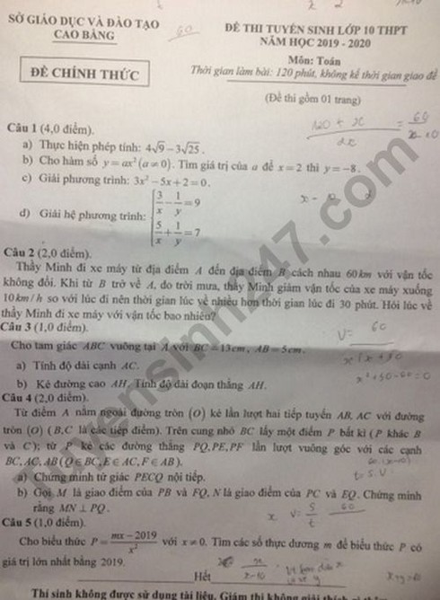 Đề thi vào lớp 10 môn Toán năm 2019 Sở GD Cao Bằng: