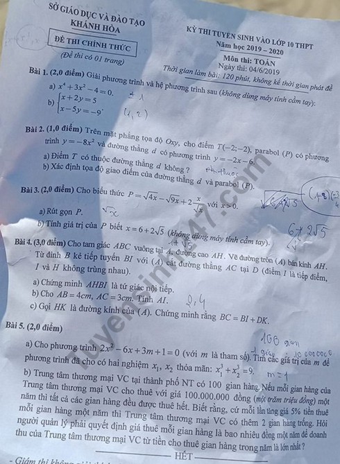 Đề thi vào lớp 10 môn Toán tỉnh Khánh Hòa năm 2019: