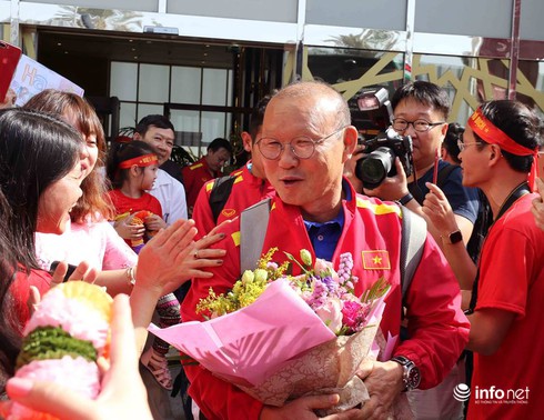 -Nụ cười của HLV Park Hang-seo tại sân bay UAE trước các cổ động viên. |