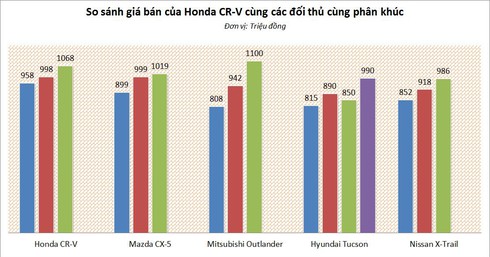 Trong khi đó, nếu so với hai đối thủ khác là Nissan X-Trail và Hyundai Tucson thì Honda CR-V có giá bán chênh lệch nhiều hơn, khoảng 100 triệu đồng. Cụ thể, Nissan X-Trail có hiện có giá bán dao động từ 852-986 triệu đồng, trong khi đó Hyundai Tucson có giá bán chỉ từ 815 – 990 triệu đồng.