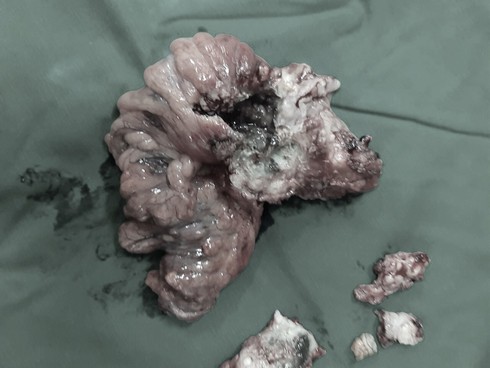 Gần đây, ông T. thấy đi ngoài phân có máu, sụt 6 kg không rõ nguyên nhân mới vào bệnh viện khám. Bác sĩ khám và nội soi đại trực tràng. Chẩn đoán ung thư đại trực tràng sigma. Ông T. đã được bác sĩ Bệnh viện K cùng Bệnh viện Hùng Vương phẫu thuật cắt u đại trực tràng 8,5 cm.