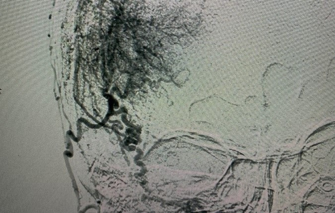 Kết quả chẩn đoán phát hiện người bệnh có u màng não lớn vùng thái dương bên phải, có nhiều mạch máu nuôi u. Bác sĩ lên kế hoạch phẫu thuật.