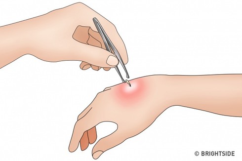 Ong để lại ngòi ở vết đốt. Do vậy hãy dùng một chiếc nhíp, móng tay hoặc thẻ ATM đã rửa thật sạch để gẩy ngòi ra. Hãy nhớ làm một cách nhẹ nhàng để chất độc từ ngòi còn sót lại không đi thêm vào cơ thể.